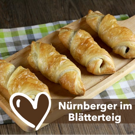 Eine echte fränkische Spezialität, Nürnberger Rostbratwürste, eingeschlagen in einen Mantel aus unserem besten Blätterteig. Das besondere Aroma entsteht durch ein leichtes Anbraten der Würstchen vor dem Backen. Den vollen Geschmack entfaltet das herzhafte Teilchen durch das Backen im Ofen.