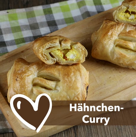 Unser herzhaften Taschen backen wir aus unserem handgerollten Blätterteig. Das Besondere unseres Blätterteiges ist, dass wir ausschließlich Butter und eben keine Margarine verwenden. Das Innere füllen wir mit einer köstlichen Currycreme mit Hähnchenbrust, Ananas und Karotten. Fertig ist ein herzhafter, kleiner Leckerbissen.