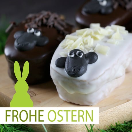 Saftig und süß sind die köstlichen Osterkuchen in Form eines knienden Lammes. Ein traditionelles und typisches Ostersymbol. Das Innerer wird aus einer hellen und butterweichen Sandmasse gebacken. Die frommen Tierchen sind mit zarter weißer und köstlicher dunkler Schokolade glasiert.