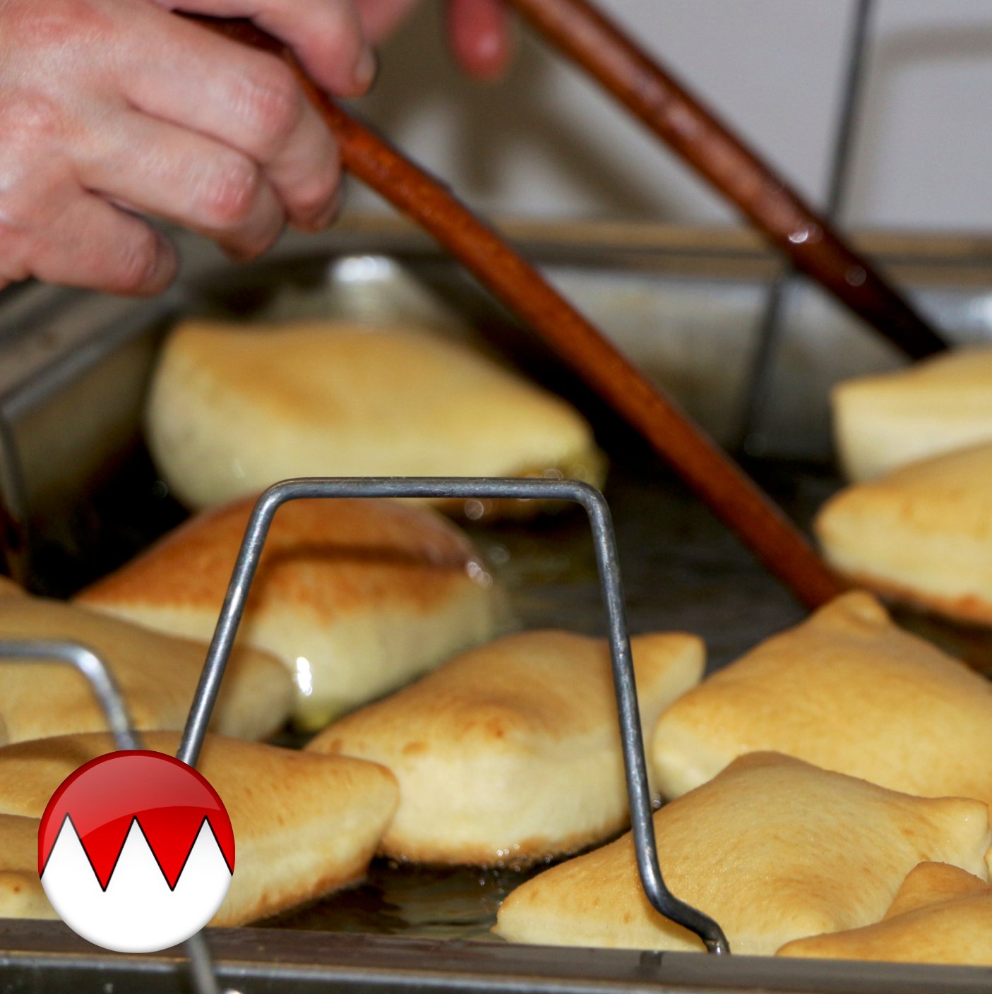 Aber wie kommt eigentlich die Luft ins "Küchle"? Das Geheimnis von unserem Senior ist eine große Schöpfkelle. Damit werden die Küchle mit heißem Fett übergossen. Durch